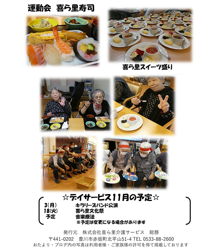 お食事は喜ら里寿司・スイーツも楽しまれ、秋のイベントを存分にお楽しみ頂きました。11月は文化祭を計画しております。